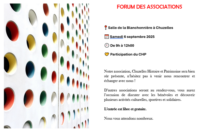 Pour chacun de ces créneaux, nous avons besoin de la présence d’adhérents du CHP afin de présenter l’histoire du patrimoine de notre commune. Merci de me confirmer, par retour de ce mail, votre présence et le créneau choisi. L’objectif est d’accompagner Jean-Yves dans cette mission et de montrer l’implication des adhérents dans ce type de manifestation.